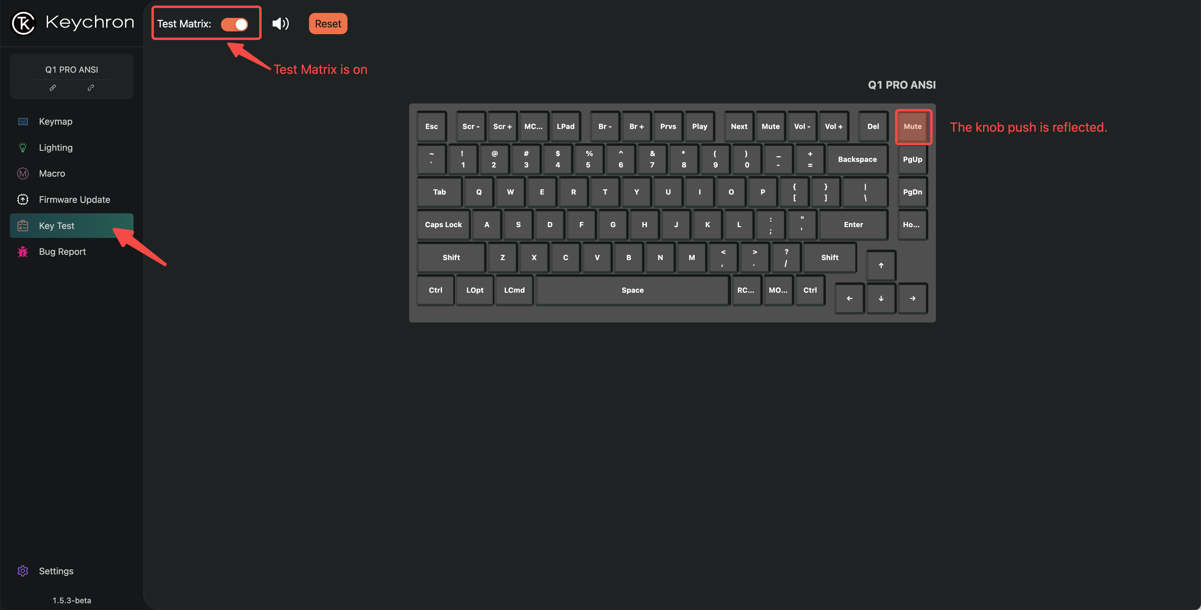 When the knobs are rotated (knob turned clockwise and counterclockwise), it cannot be detected when testing the Matrix. But if you push the knob, it will be reflected in the Matrix.